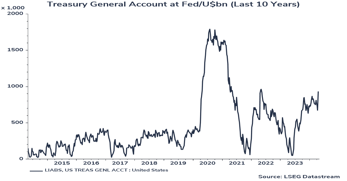 As a general rule, when the balance is rising it means liquidity is being sucked out of the financial system, which tends to coincide with a “risk off” trend in markets. Indeed, its recent spike to around U$1trn (a two-year high) is one of the reasons why equity markets have softened over the past few weeks.