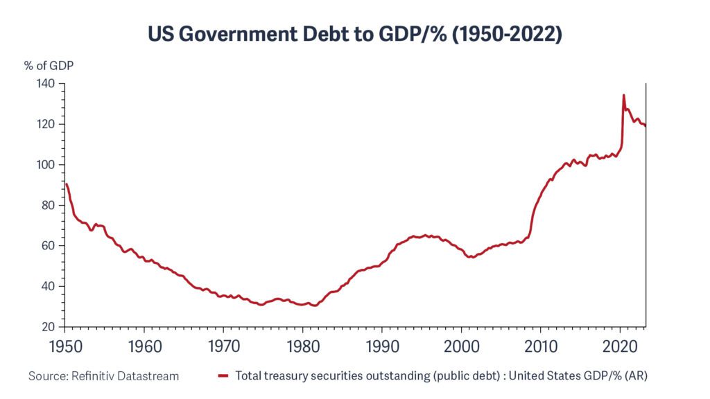 Throughout the rest of the decade (and well into the 1990s) debt use remained contained; the economic scars of the 1970s lingered, perturbing borrowers from over-extending themselves. But ever since, the amount of leverage has grown exponentially with China’s debt-fueled growth model, the Great Financial Crisis and the unprecedented fiscal spending deployed to combat the COVID-19 pandemic all contributing to a global debt-load that now exceeds U$300trn. This equates to a staggering (and record-breaking) 350% of GDP, meaning every U$1 of economic output in the world requires U$3.49 of debt use. This ratio was closer to a more sustainable 1:1 just a few decades ago.
