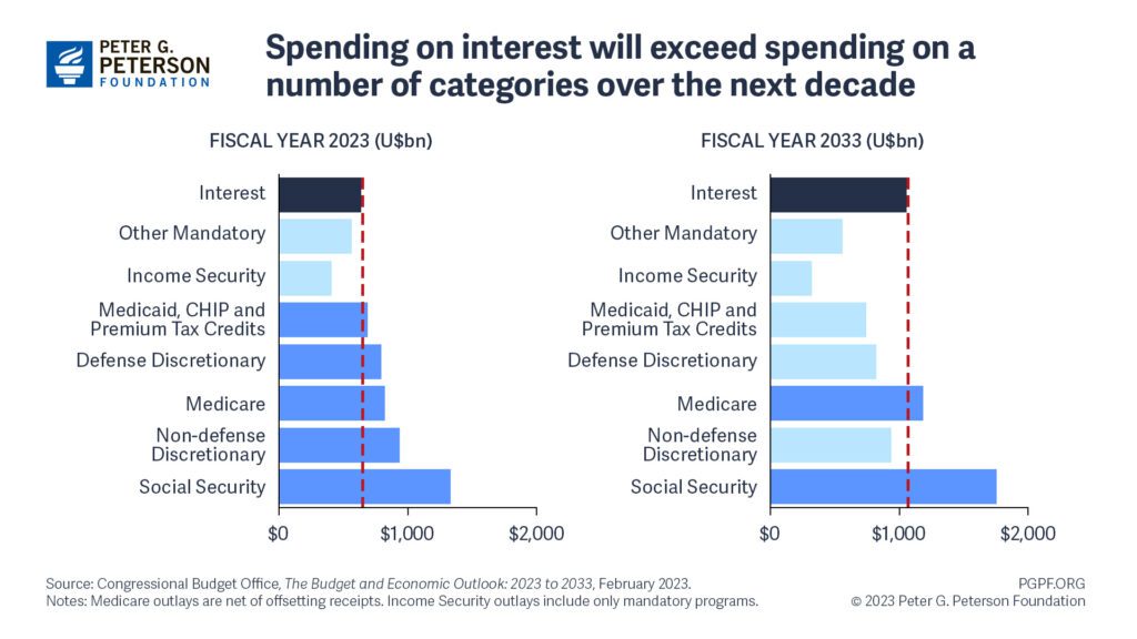 As of April 2023, the Treasury Department says it spends a net amount of almost U$500bn per year just on interest payments, equivalent to approx. 13% of total federal spending. Both of these figures look set to rise (by a lot) over the next few years, leaving interest payments on track to become an even more dominant component of the public purse.