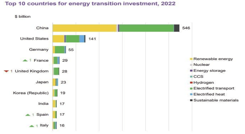 Nowadays, though, state-backed spending is increasingly being directed towards cutting-edge areas like quantum computing, green energy and space rather than railways, airports and roads. In 2022, China invested (by far) the most into energy transitions projects as the chart below shows. The only problem is it borrowed even more money to do so…