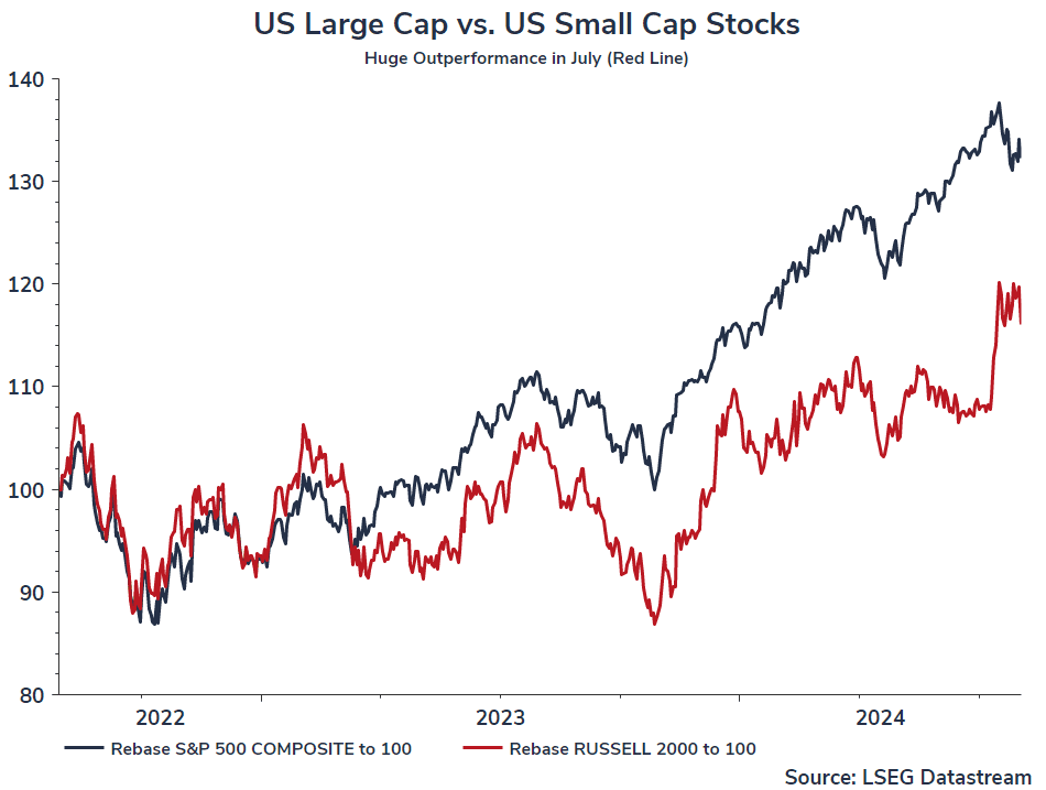 In support of that view, one of the catalysts for the rotation was certainly the softer CPI inflation figure released on 11th July. That, plus cooling employment figures, raised hopes for a rate cut by the Federal Reserve as soon as September, which in turn would alleviate the financing costs of the vast majority of American firms that rely on bank financing for access to funds. Only the biggest firms can sell bonds in the capital markets. Everybody else relies on bank financing. So a sign from Central Bankers that we have turned the corner in the fight against inflation, opening the way for longed-for interest rates cuts was welcome. The ensuing rise in small cap stocks was beneficial but despite that, they continue to trade at relatively undemanding valuations. This means that any further good news on the macro front, which increases the probability of additional rate cuts, would mean further gains, at least for small cap stocks relative to the market as a whole.