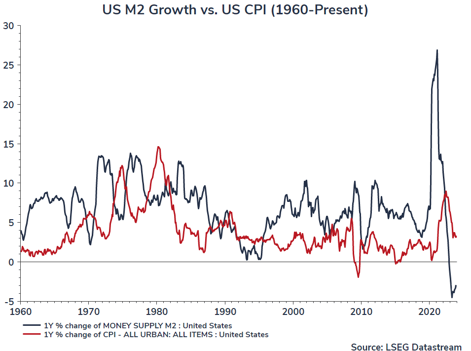 The policy backdrop is also different. Unlike the indiscriminate monetary and fiscal largesse that was deployed during the pandemic, interest rates are at multi-decade highs and most Central Banks continue to shrink their balance sheets. The slump in US money supply growth, from a peacetime record +27% y/y in early 2021 to the state of contraction that began in mid-2023, is representative of the global trend and suggests deflation is the bigger threat. As the chart below shows, money supply rates tend to be a good lead indicator of CPI.