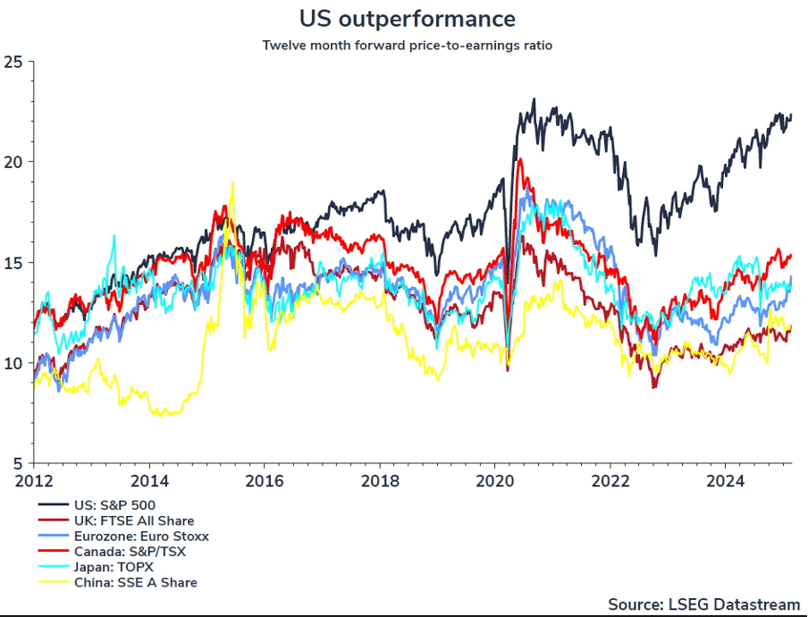 The phrase “US exceptionalism” has almost become common parlance in investment circles. It is a term used to reflect the valuation premium ordinarily attached to the US stock market and to justify its continued outperformance versus the rest of the world. This outperformance has occurred for most of the fifteen years since the Global Financial Crisis (GFC), with the MSCI US index also returning more than double its World ex-US counterpart from 2020 to the end of 2024. Not surprisingly, a recent Goldman Sachs poll confirmed that a record percentage of investors expect the US to outperform and the Eurozone to underperform once again in 2025. These expectations influence investor flows which, in turn, drive already elevated stock prices even higher.
