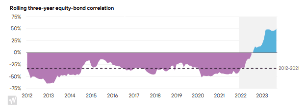 The macroeconomic environment has shifted considerably since 2021, with inflation and interest rates remaining stubbornly high and bond and equity markets exhibiting positive three-year rolling correlations for the first time since the 1990’s (see chart below).