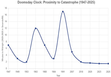 The Doomsday Clock is a symbolic timepiece, maintained by the Bulletin of the Atomic Scientists since 1947. It is intended to represent how close humanity is to global catastrophe, with midnight symbolising annihilation from manmade threats such as nuclear and biological weapons, climate change (added in 2007), and disruptive technologies such as AI (added in 2018). The clock is not a literal prediction intended to inspire fear but a metaphor to warn both the public and their policymakers, urging them to action in order to “turn back the hands.”
