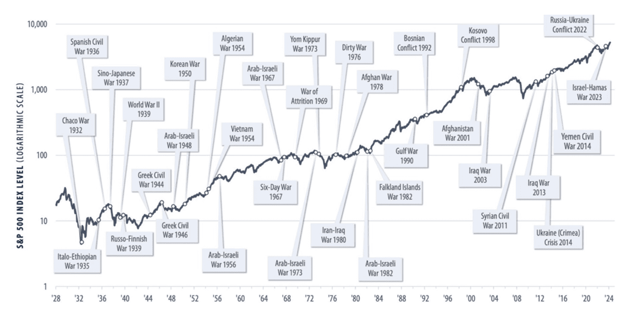 What to do? First, remember that “time in the market” will always be a far better strategy than “timing the market”. More often than not, the impact of geopolitical events on the economy turns out to be relatively muted. As the chart below shows, it is vital to maintain a long-term perspective. Since 1940, the S&P 500 has been higher one year after a major geopolitical crisis 85% of the time. And where the S&P goes, the world will follow.
